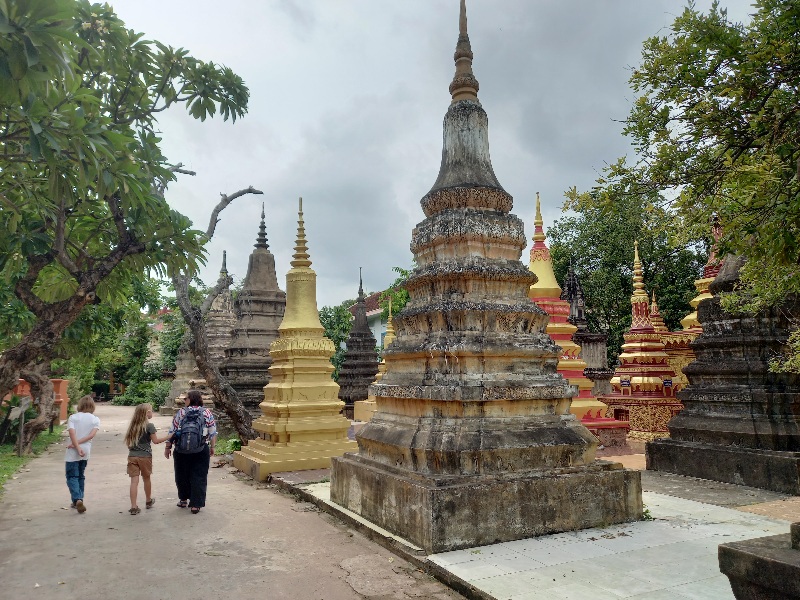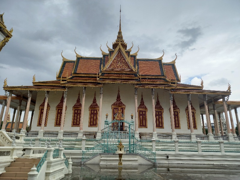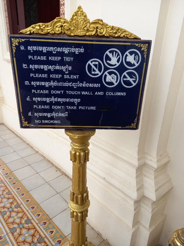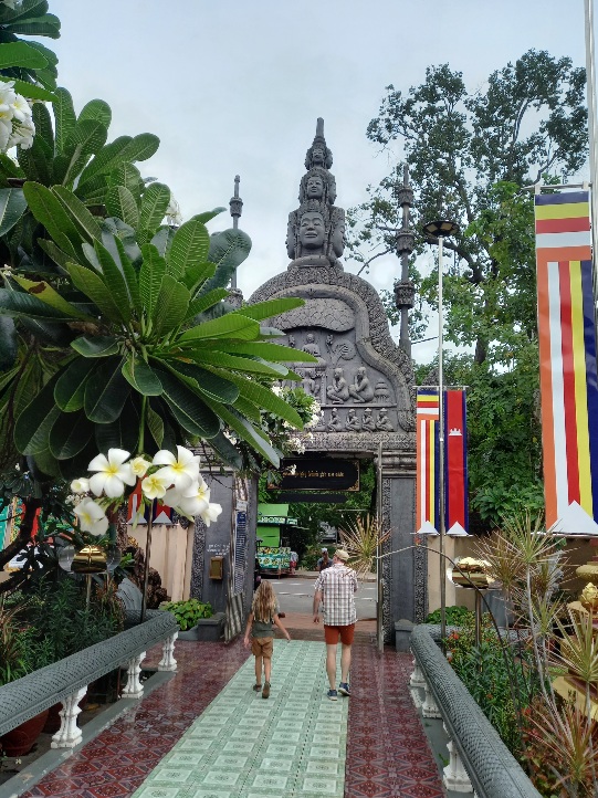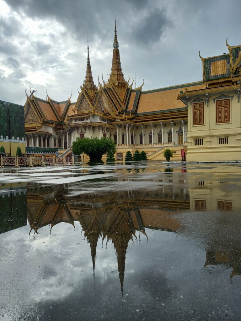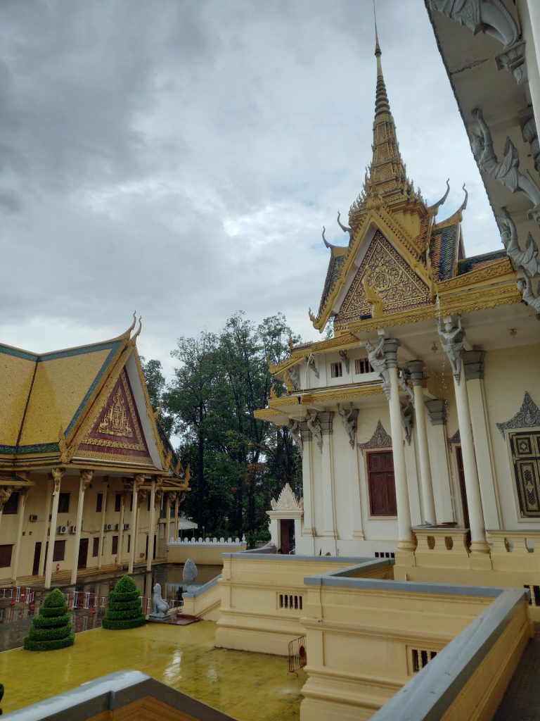 Bis zur Abfahrt stellte sich keine eindeutige Haltung zu der Stadt ein, vielleicht ist dies auch einfach der Umstellung von Vietnam auf Kambodscha geschuldet. Nichts desto trotz erkundeten wir am nächsten Tag die Stadt zu Fuß. Das ist echt schwer, da überall Tuk-Tuks auf einen warten und dich irgendwo hinfahren möchten. Trotz allem spazierten wir los, erstiegen den Pnom Wat (27m) und besichtigen den heiligen Tempel. Daneben schließt sich das French Quarter mit der Hauptpost an, wo wir uns treiben ließen. Die Kambodschaner sahen/sehen die Franzosen nicht als Kolonialherren, sondern eher als Beschützer da ohne sie vermutlich Kombadscha zwischen Thailand und Vietnam aufgeteilt worden wäre, berichtete uns ein Kambodschaner ein paar Tage später. Zum Abschluss und als Highlight des Tages sind wir noch in den Königspalast, in welchem u.a. der Thronsaal, die Silberpagode (ausländische Bezeichnung)/Emeraldpagode (inländische Bezeichnung) und das weiträumige Gelände besucht werden kann. In Kambodscha haben wir keine Reiseleitungen für die Ausflugsziele vorgebucht. Es gibt lizenzierte Reiseführer, welche vor Sehenswürdigkeiten auf Gäste warten. Unsere englischsprachige Guidin erklärte uns, dass wir Glück hätten da der König zu seinem jährlichen Check up in China ist und somit alle Gebäude bis auf das Privathaus besichtigt werden können. Durch die Führung durch die Palastanlage konnten wir viel über kambodschanischen Buddismus und Hinduismus lernen, die Khmer Architektur der Gebäude bestaunen sowie 1000 Buddhastatuen. Jede Familie, die es sich leisten kann, bringt dem König oder seiner Mutter eine Buddhastatur und diese wird dann in seinem Tempel ausgestellt. Da wir ja nur einen Kurzausflug😂 durch Phnom Penh geplant hatten konnten die Kids die wollten, dann gegen halb fünf oder etwas später in den Rooftop Pool.
