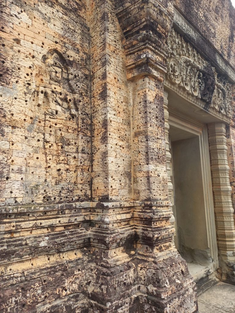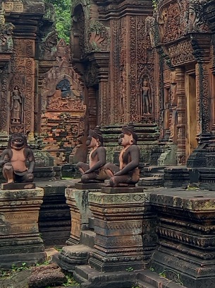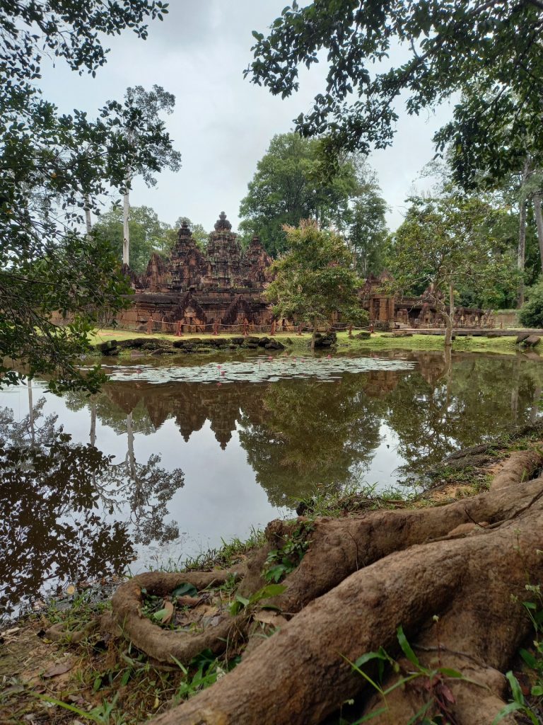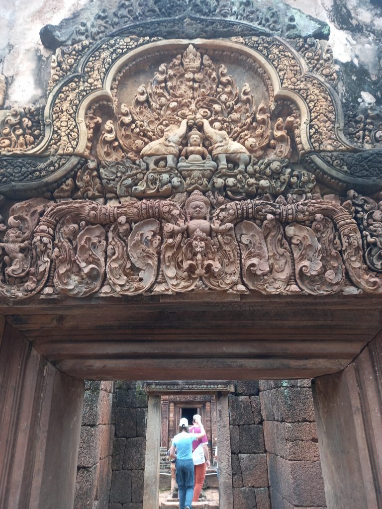 Am vierten Tag in Seam Reap wurden wir wieder von unserem Reiseleiter Yim Savy um 8 Uhr vom Hotel abgeholt. Zuerst fuhren wir 35 km nördlich zur Tempelanlage Banteay Srei, welches oft als das Juwel unter den Tempeln bezeichnet wird. Es wurde erst 1914 „entdeckt“ und zehn Jahre später vom Dschungel befreit. Der Name bedeutet „Zitadelle der Frauen“.